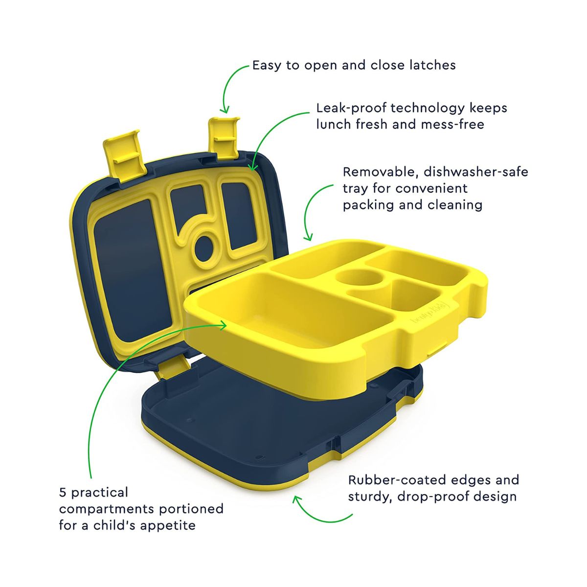 - 5 prácticos compartimentos porcionados perfectamente para el apetito de un niño para fomentar una comida saludable y equilibrada (recomendado para edades de 3 a 7 años). - Tecnología a prueba de fugas: mantiene las comidas y aperitivos frescos y sin problemas durante el transporte - Diseñado con 2 cierres aptos para niños que son fáciles de abrir y cerrar para manos pequeñas. - Diseño a prueba de caídas: fabricado con bordes duraderos recubiertos de goma que protegen la fiambrera cuando se cae.