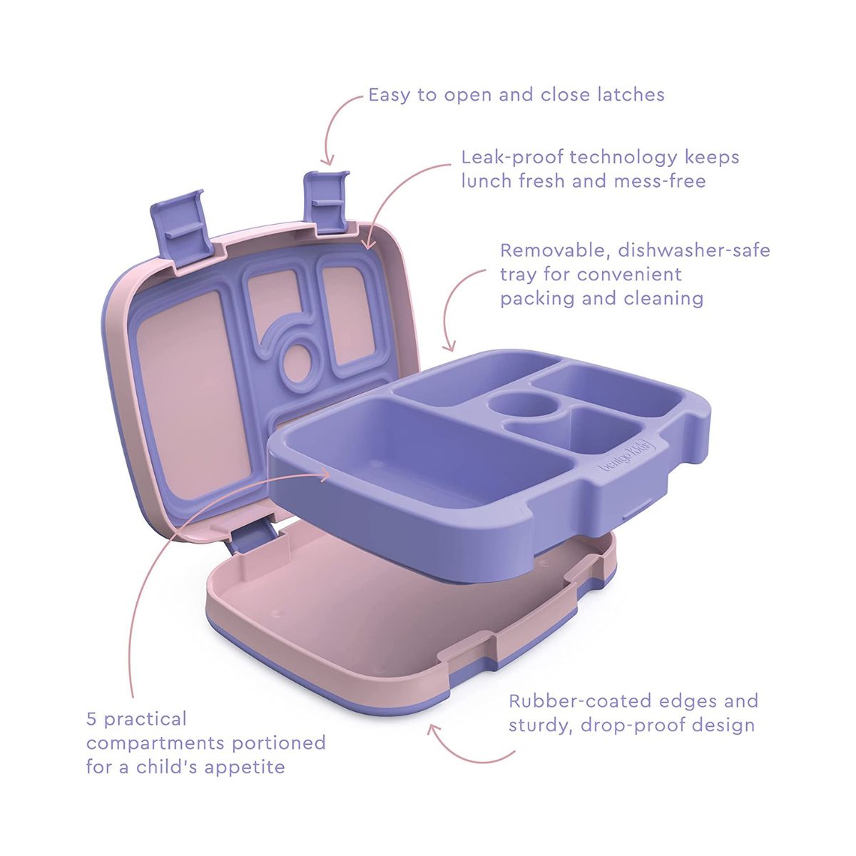 - 5 prácticos compartimentos porcionados perfectamente para el apetito de un niño para fomentar una comida saludable y equilibrada (recomendado para edades de 3 a 7 años). - Tecnología a prueba de fugas: mantiene las comidas y aperitivos frescos y sin problemas durante el transporte - Diseñado con 2 cierres aptos para niños que son fáciles de abrir y cerrar para manos pequeñas. - Diseño a prueba de caídas: fabricado con bordes duraderos recubiertos de goma que protegen la fiambrera cuando se cae.