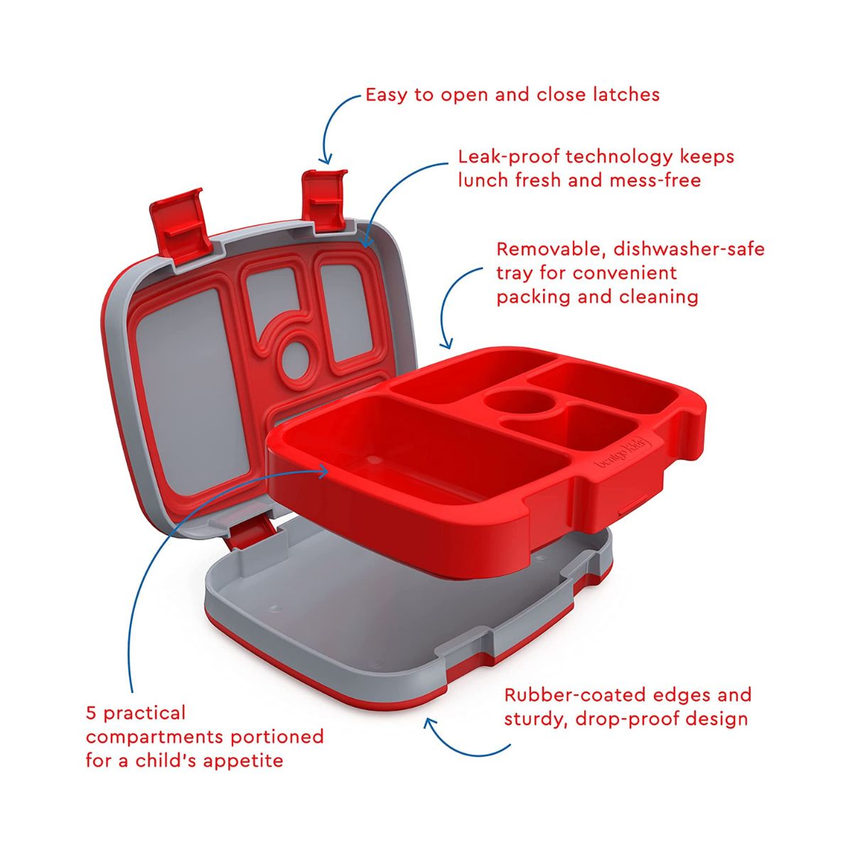 - 5 prácticos compartimentos porcionados perfectamente para el apetito de un niño para fomentar una comida saludable y equilibrada (recomendado para edades de 3 a 7 años). - Tecnología a prueba de fugas: mantiene las comidas y aperitivos frescos y sin problemas durante el transporte - Diseñado con 2 cierres aptos para niños que son fáciles de abrir y cerrar para manos pequeñas. - Diseño a prueba de caídas: fabricado con bordes duraderos recubiertos de goma que protegen la fiambrera cuando se cae.
