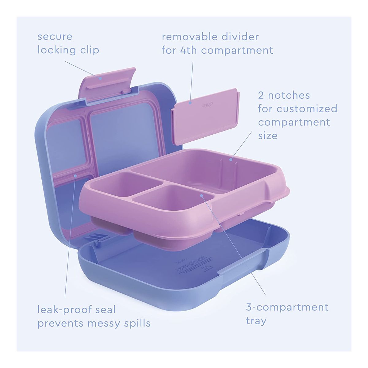 - 5 prácticos compartimentos porcionados perfectamente para el apetito de un niño para fomentar una comida saludable y equilibrada (recomendado para edades de 3 a 7 años). - Tecnología a prueba de fugas: mantiene las comidas y aperitivos frescos y sin problemas durante el transporte - Diseñado con 2 cierres aptos para niños que son fáciles de abrir y cerrar para manos pequeñas. - Diseño a prueba de caídas: fabricado con bordes duraderos recubiertos de goma que protegen la fiambrera cuando se cae.