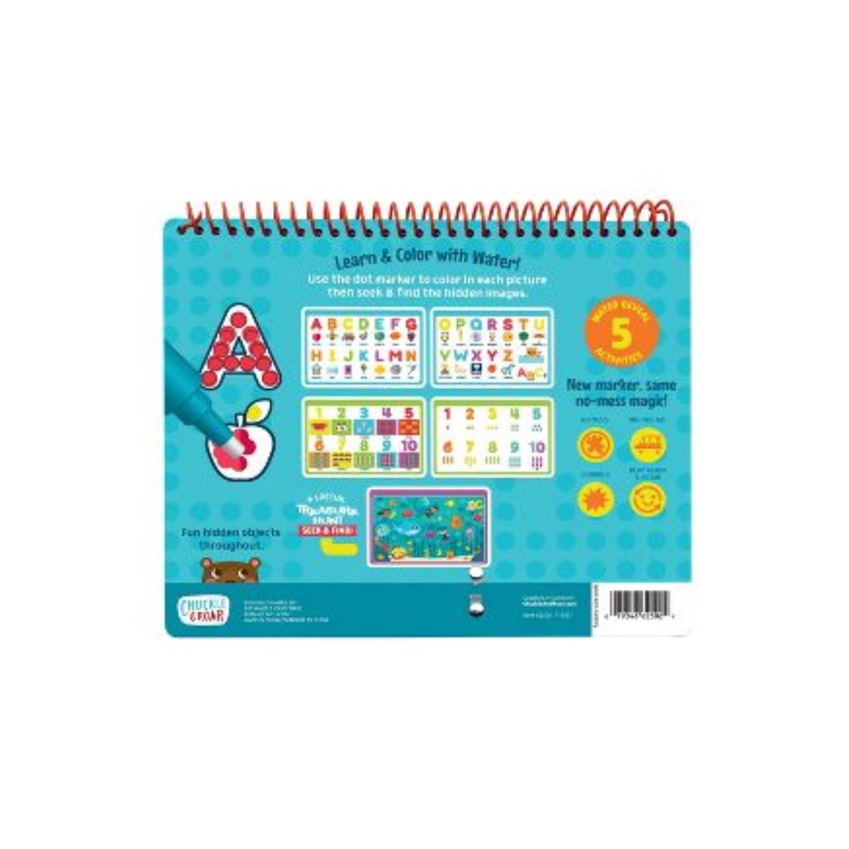 - Incluye 5 páginas de revelación de agua y un mercado de puntos lleno de agua que no ensucia - A partir de 3 años - Las actividades de aprendizaje incluyen: el alfabeto, los números y el conteo - Cada página contiene objetos ocultos adicionales que son divertidos de encontrar - Sin desorden significa que su hijo puede jugar esto una y otra vez