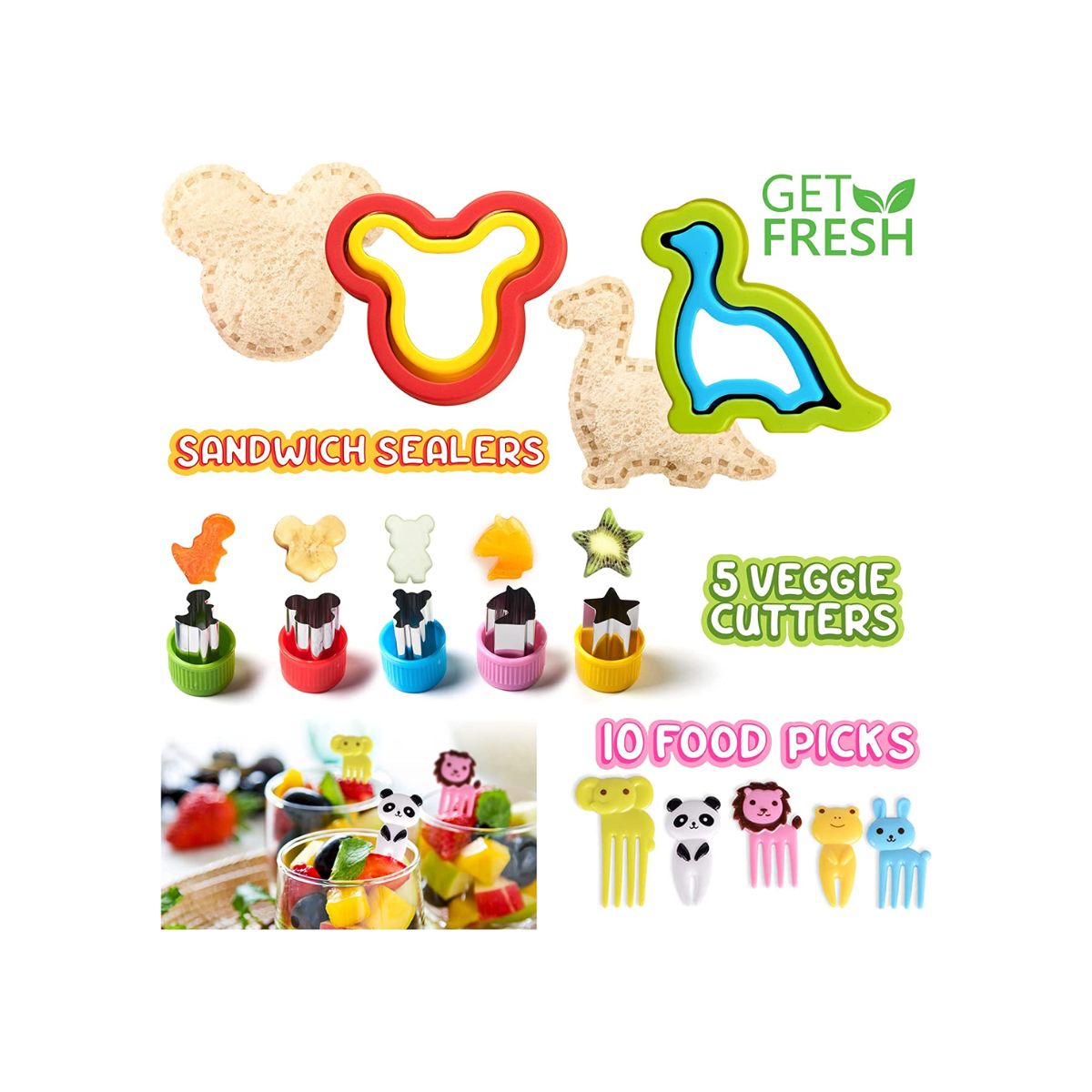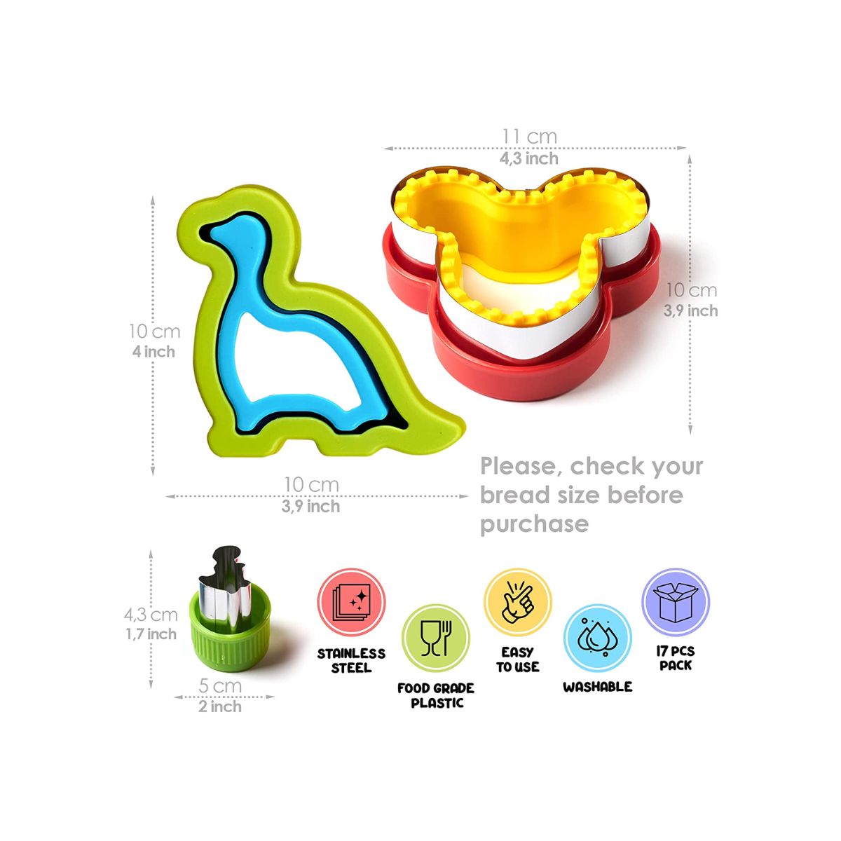 - Colorido juego de cortadores y selladores de sándwich para niños incluye las formas más populares: lindo ratón y divertidos selladores de sándwiches de dinosaurio; 5 cortadores de frutas y verduras: unicornio, oso, estrella, ratón, dinosaurio; 10 bonitos palillos de comida de animales. - Cada juego de sandwichera y dectuster de pan para niños viene en una caja colorida y resistente - Ideal para fiestas en el hogar y al aire libre