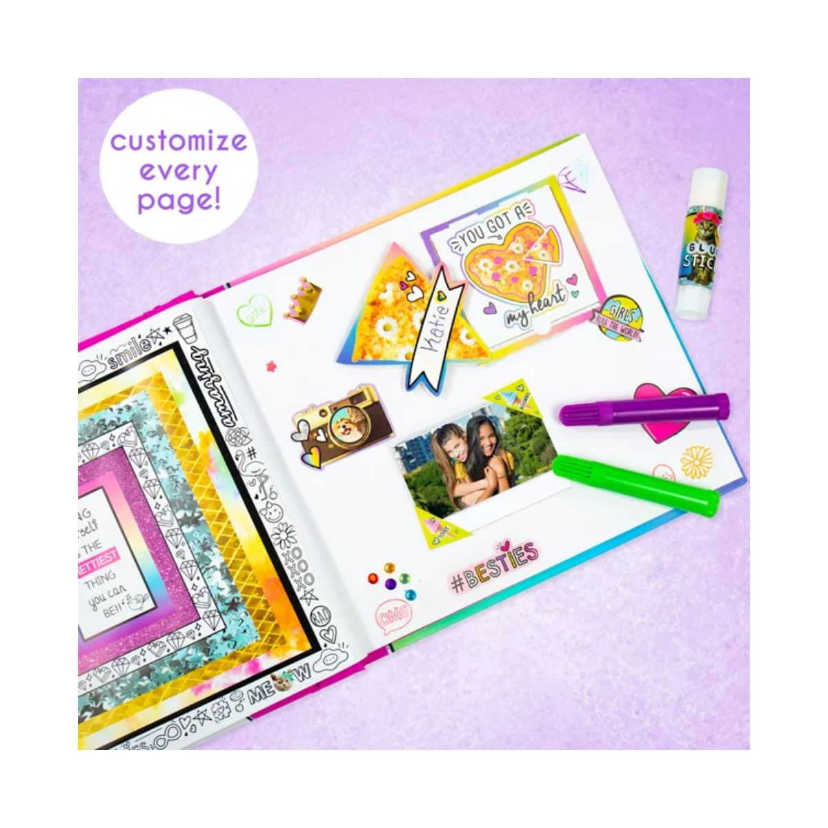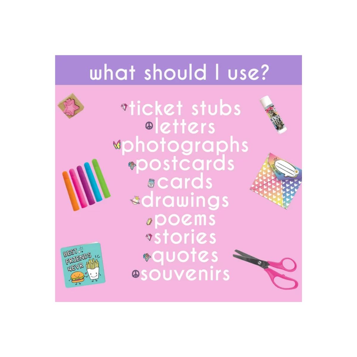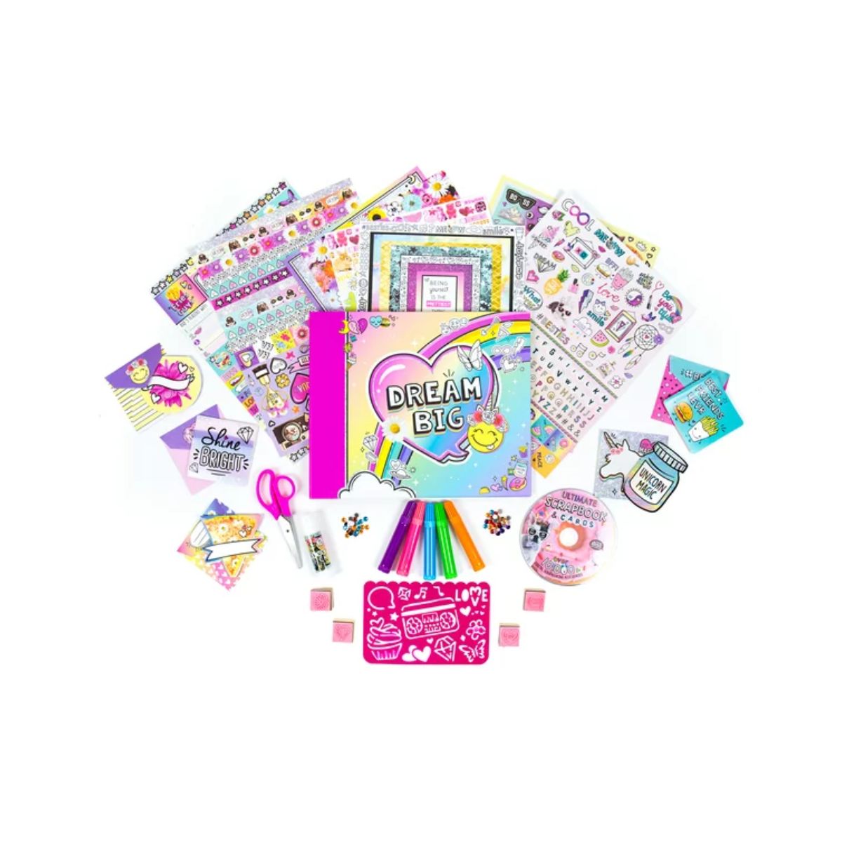 - A partir de 6 años - Incluye calcomanías vibrantes y brillantes como unicornios, corazones, flores, hashtags y frases, y mucho más! ¡Usa las pegatinas de letras del alfabeto para escribir tus frases favoritas o subtitular quién está en las imágenes - El kit incluye : 1 estuche de almacenamiento de plástico (13, 75 L x 3, 25 W x 14, 25 H), 1 álbum de recortes (8, 5 x 11 in, 30 páginas), 1 CD, 5 tarjetas y sobres, 1 plantilla, 4 sellos de madera, 5 marcadores, 4 Páginas impresas, 2 hojas perforadas, 50 piedras preciosas brillantes, 2 hojas de calcomanías, 1 par de tijeras, 1 barra de pegamento, instrucciones fáciles de seguir